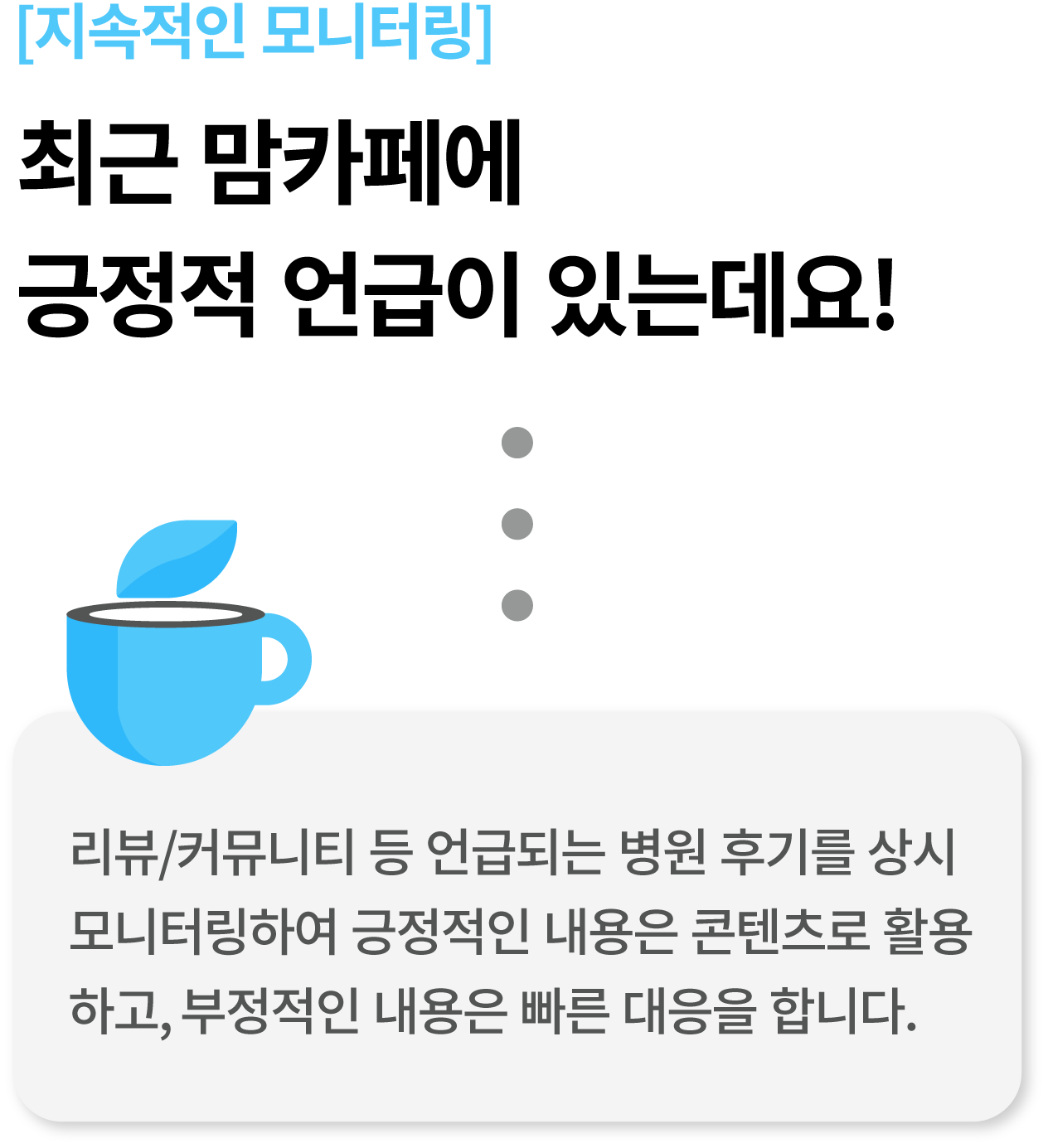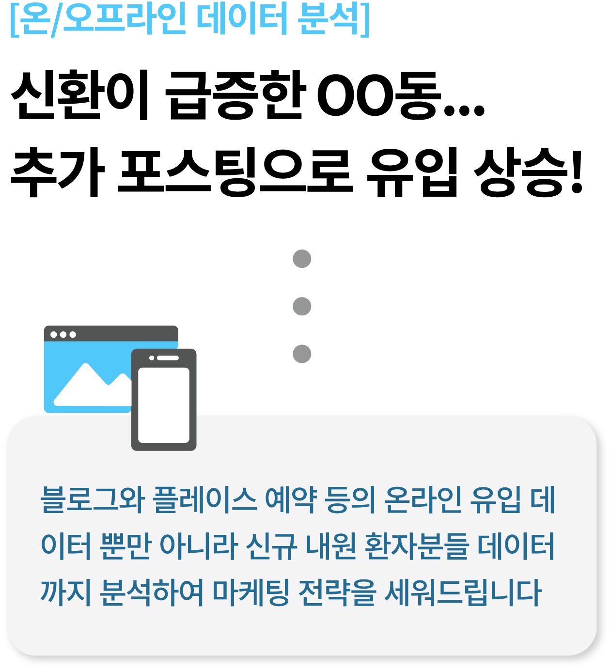 단순한 진료과목만 암기하지 않습니다. 기억에 남는 진료 사례, 자신 있는 치료방법 등 병원과 원장님에 대한 세부적인 정보를 파악하여 환자의 기억에 남는 노출 전략을 세웁니다.
